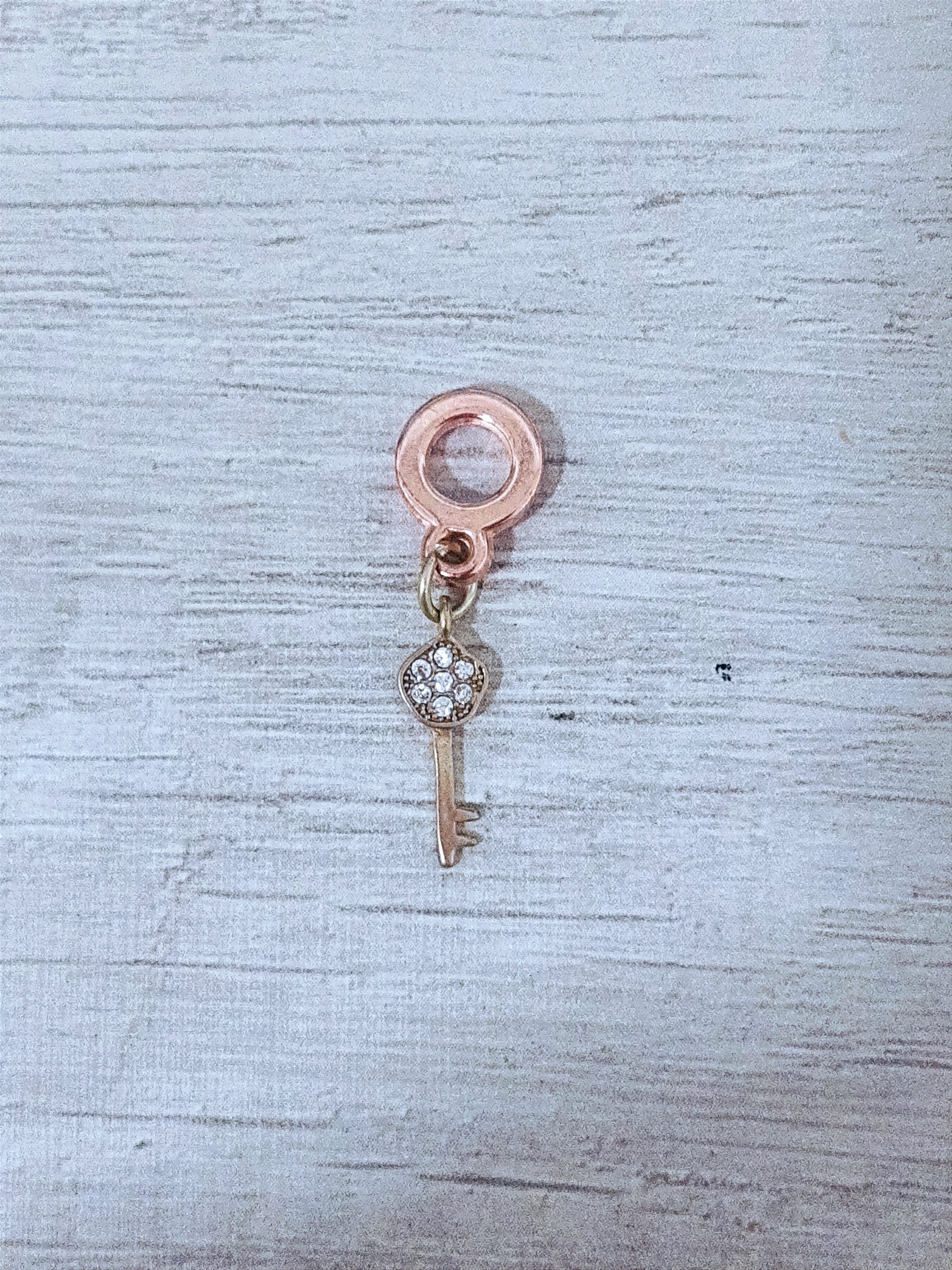 Berloque chave com microzircônia. P0,8g. T 2,9 mm. Em latão e abs