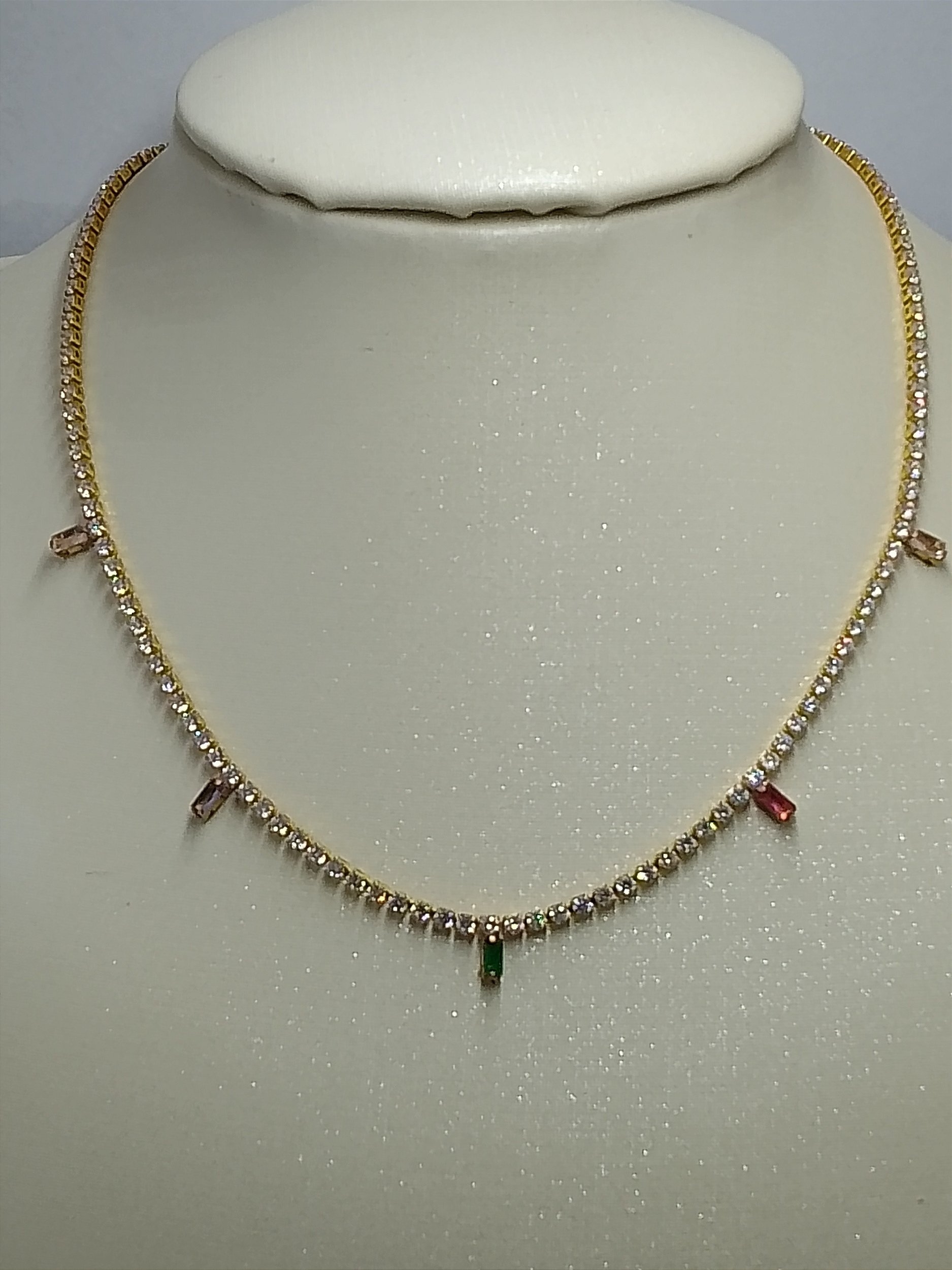 Choker zircônia 2 mm com baguete colorida. T 30 cm +10 cm extensor. P4g